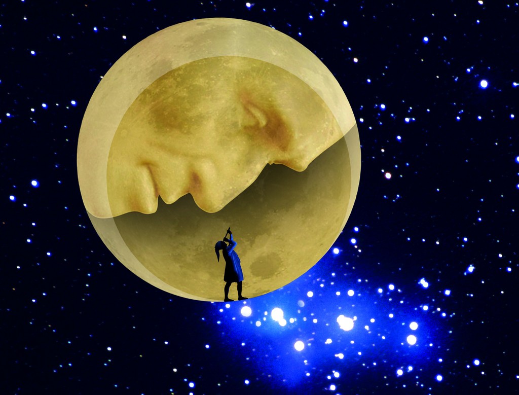 Жадный венецианский купец Буонафеде рассчитывает выдать дочерей замуж за богачей и слышать не желает о браке Клариче и Фламинии с их возлюбленными Эрнесто и Эккликтико. Последний, пользуясь страстью купца к астрономии, предлагает тому взглянуть в телескоп и показывает целующихся молодых людей и девушек. Эккликтико объявляет, что Буонафеде видит обитателей Луны, и тот загорается желанием побывать на Луне. Молодые люди с помощью слуг разыгрывают для него такое «путешествие», предварительно опоив одурманивающим порошком. Купец верит, что находится на Луне. Верит он и в то, что ради благосклонности лунной королевы, которую более или менее удачно изображает служанка, ему придется уступить просьбам своих дочерей, разрешив Клариче и Фламинии выйти замуж за их возлюбленных — но даже это не заставляет его изменить решение. Понимая, что хитрость не достигла цели, влюбленные признаются в обмане. Буонафеде приходит в ужас: неужели теперь весь город узнает, как он позволил себя обмануть? Во избежание такого ущерба для своей репутации, он разрешает дочерям выйти за тех, за кого они пожелают — и влюбленные пары счастливо соединяются.